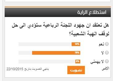 اعرب ثمان وسبعون بالمئة من المستطلعين أراؤهم بأن جهود الرباعية الدولية لن تؤدي إلى حل وقف الهبة الشعبية.