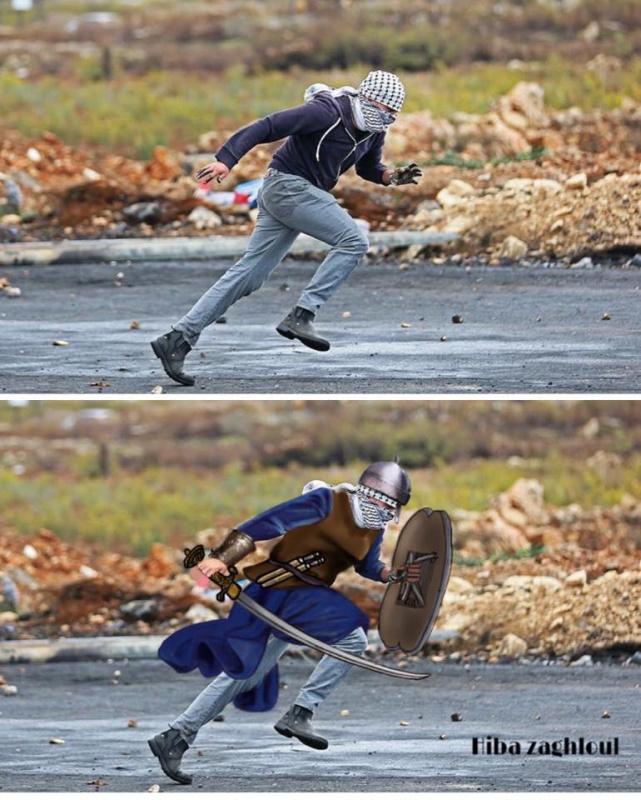 اما عن رسمة الشاب المقاوم وهويرتدي الخوذة وفي اسفلها الكوفية الفلسطينيه وويحمل الدرع والسيف والسهم توضح زغلول انها حاولت ربط التاريخ القديم بجيل الحاضر خوذة ودرع وسيف وسهم حملوها أسلافنا وصلاح الدين الأيوبي في القدم لمقاتلة الأعداء لتحرير القدس الشريف