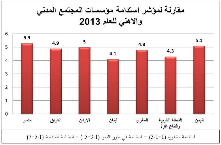 وفي الضفة الغربية وقطاع غزة نفذت مؤسسة مجتمعات عالمية هذا المشروع ابتداء من العام 2011، وتم التوصل إلى نتائج تفيد بأن وضع مؤسسات المجتمع المدني والأهلي في الضفة وغزة يمتاز مع لبنان بتقدم ملحوظ عن الدول العربية الأخرى المشاركة. فقد تم التوصل إلى أن الضفة الغربية وقطاع غزة تتمتع بمعدلات استدامة عالية (4.3) في مؤسسات المجتمع المدني والأهلي. وتعتبر الضفة الغربية وقطاع غزة المنطقة العربية الوحيدة إضافة إلى لبنان التي صنف جميع مجالاتها السبعة ضمن فئة "طور النمو" في الوقت التي احتوت باقي الدول على مجالات صنفت ضمن فئة "الاستدامة المتدنية".