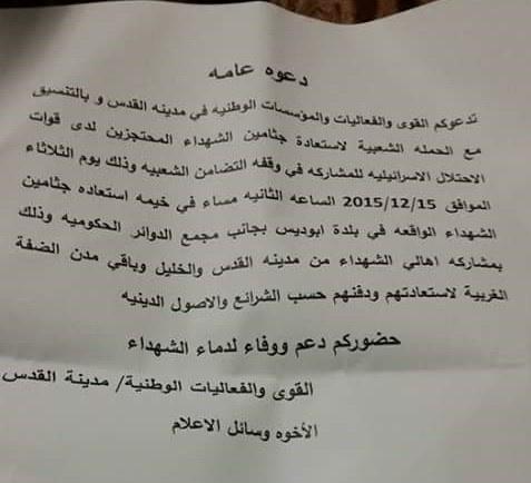 دعت القوى والفعاليات والمؤسسات الوطنية في القدس المحتلة بالتنسيق مع الحملة الشعبية لاسترداد جثامين الشهداء المحتجزين لدى سلطات الاحتلال الإسرائيلي إلى المشاركة غدًا الثلاثاء في وقفة التضامن الشعبية في بلدة أبو ديس.