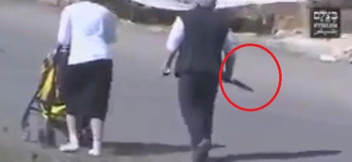 ويُظهر الفيديو مستوطنتين تجران عربة اطفال وتحمل احداهن سكيناً وتنظر الى خلفها اثناء سيرها .