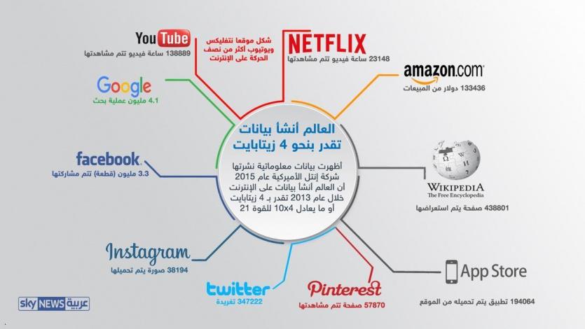 وأظهرت الدراسة أن 4.1 مليون عملية بحث تتم عبر موقع غوغل كل دقيقة، في حين يتم مشاركة 3.3 مليون "قطعة" عبر فيسبوك، سواء أكانت صورة أو مادة مكتوبة أو غيرها، بينما يتم إرسال 347222 تغريدة عبر موقع تويتر، ويتم تحميل 38194 صورة على موقع إنستاغرام.