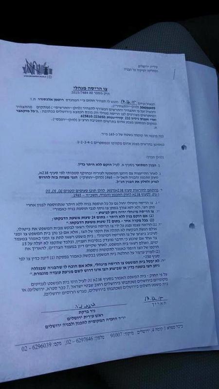 أمر الهدم تم تسليمه للعائلة الساعة الثانية فجرا، بحجة البناء بدون ترخيص، وستقوم جرافات الاحتلال بتنفيذ عملية الهدم خلال الفترة الواردة في القرار وهي 48 ساعة.