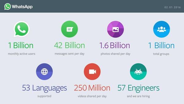 وأشارت الشركة في مدونتها الرسمية إلى تخطيها حاجز مليار مستخدم نشط شهريًا، وهو ما يقارب واحد من كل سبعة أشخاص على الكرة الأرضية يستخدم "واتس آب" كل شهر من أجل البقاء على اتصال مع أحبائه وأصدقائه وعائلته.