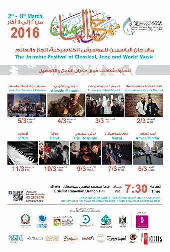 ويتابع المهرجان عروضه مع الموسيقي الايطالي أليسيو منكوني الجمعة 4.3 في رام الله والسبت 5.4 في بيت لحم، يقدم فيه خليطا من الجاز الكلاسيكي والبوب الأمريكي والإيطالي. ومن الدنمارك وفلسطين، حيث يأتي هذا العرض ضمن مشروع دمج الموسيقى الذي نفذه البيت الدنيماركي في فلسطين مع المعهد الوكني للموسيقى في القدس والأكاديمية الملكية للموسيقى في مدينة آرهوس الدنماركية، سيقدمون عرضا يوم الجمعة 4.3 في القدس، وفي رام الله 5.3 في رام الله.
