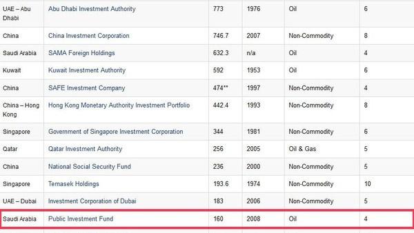 أشارت آخر بيانات معهد SWFI المتخصص في رصد حركة الصناديق السيادية العالمية، إلى تقدم صندوق الاستثمارات العامة السعودي إلى المرتبة 13 عالمياً، بإجمالي أصول بلغ 160 مليار دولار.