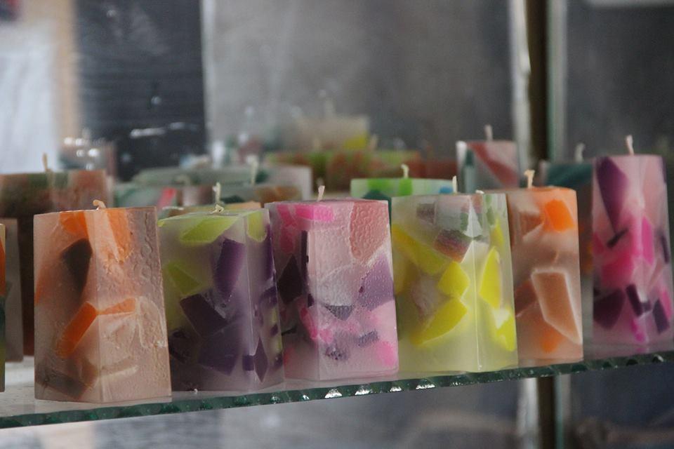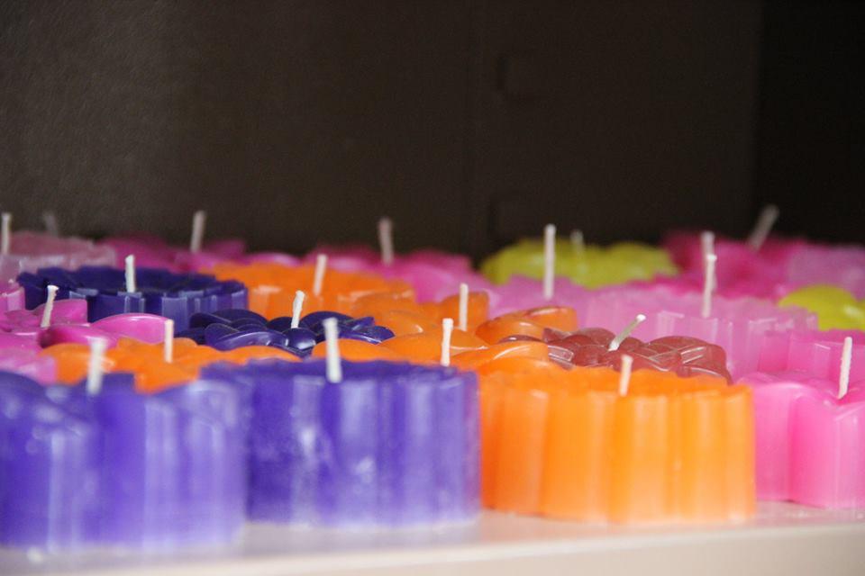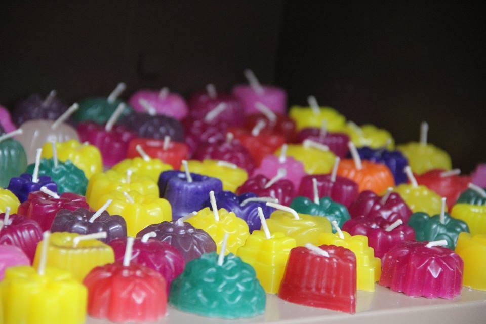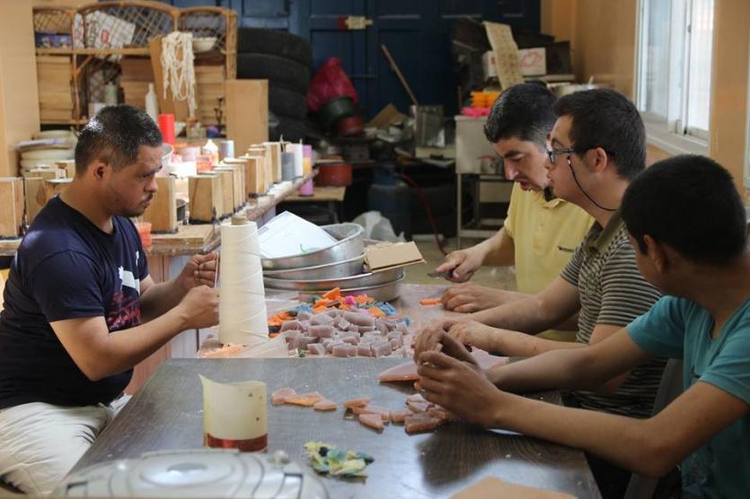 في مشغل الشموع بمركز الرجاء هناك خمسة طلاب من ذوي الاعاقة العقلية المتوسطة والبسيطة يعملون في مساحة تتسع لتفريغ طاقاتهم وحبهم بالشمع منذ عام 2003.