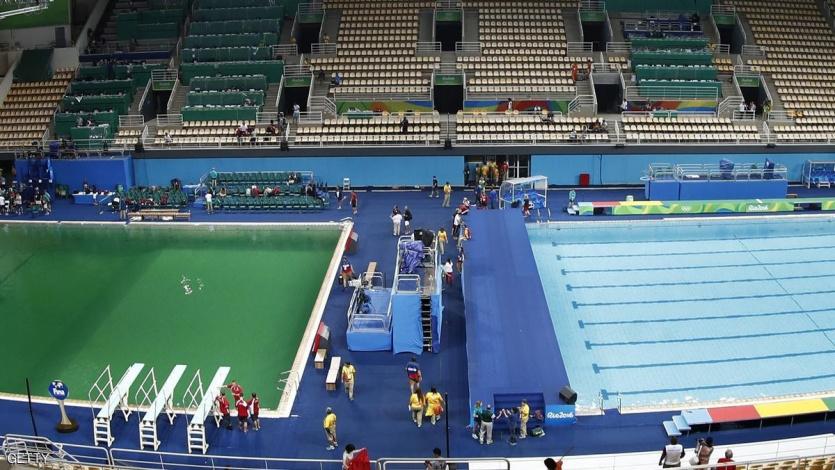 بشكل مفاجئ تحول لون بعض المسابح الأولمبية التي تستضيف منافسات أولمبياد ريو من الأزرق إلى لون أخضر يوحي بأن شيئا غير طبيعي يحدث داخل الماء.