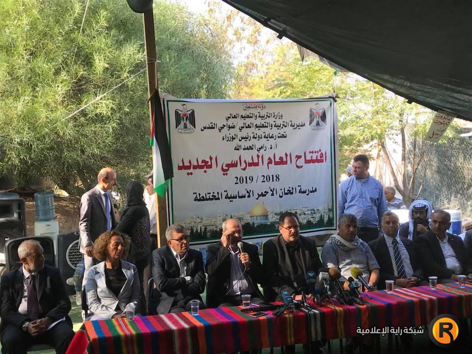 افتتحت وزارة التربية والتعليم العام الدراسي الجديد في قرية الخان الأحمر شرق القدس المحتلة، وذلك في قرار جاء بهدف تعزيز صمود أهلها.