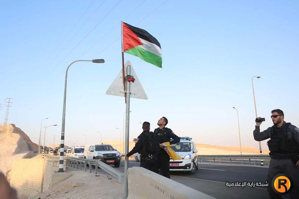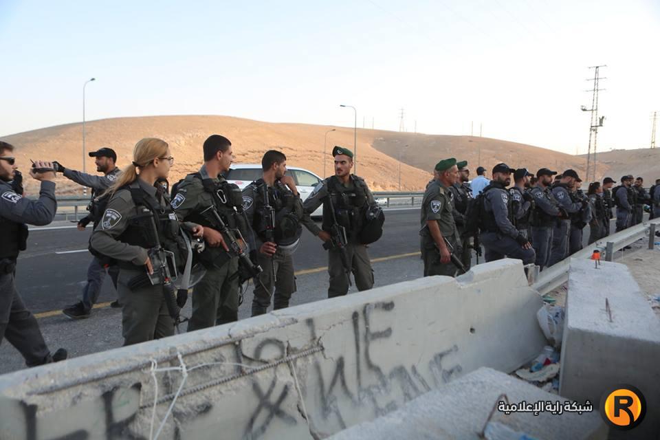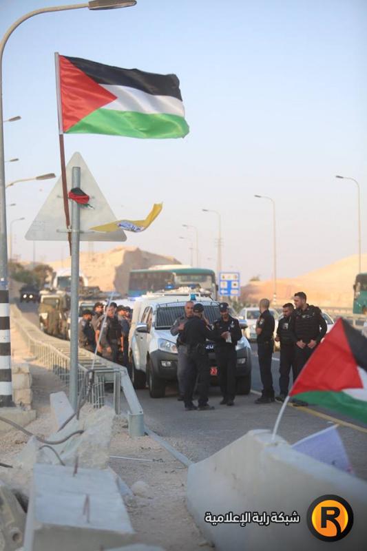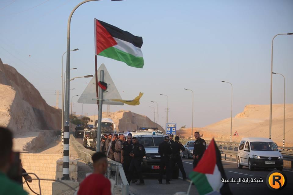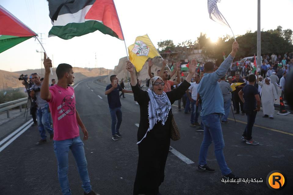 نظم نشطاء ومتضامنون مسيرة على الشارع الرئيسي "القدس-أريحا" قرب قرية الخان الأحمر تنديداً بقرار الاحتلال بهدمها وترحيل سكانها، وتصدمت لهم قوات الاحتلال وحاصرتهم وأجبرتهم على إخلاء الشارع.