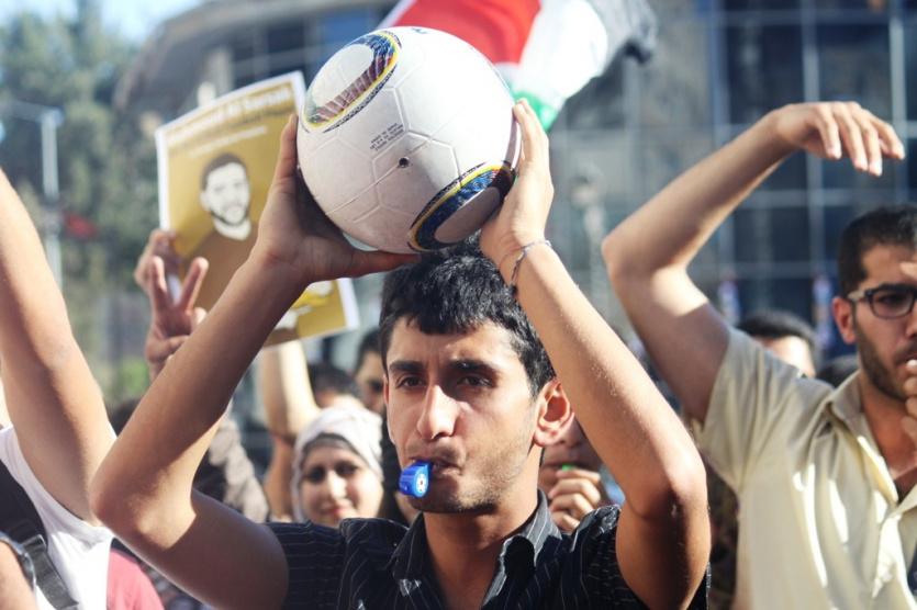 مجموعة من النشطاء الشباب يخرجون في مدينة رام الله يحملون كرات تضامنا مع الأسير محمود السرسك