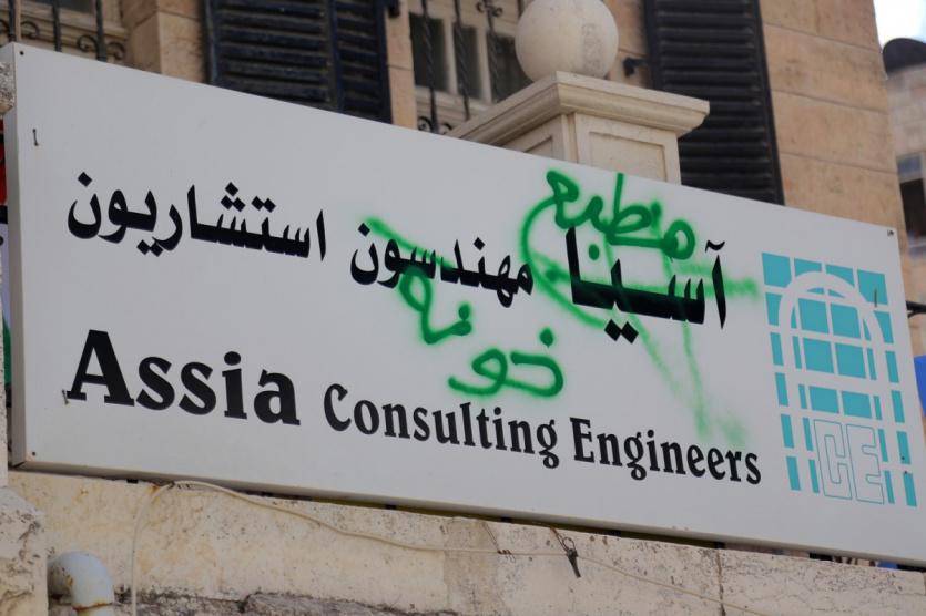 صور من تظاهرة اقامها ناشطون من لجان المقاومة الشعبية امام مقر مؤسسة "أسيا" وسط مدينة رام الله وهي مؤسسة تعنى بمجال الهندسة والاستشارات الهندسية، حيث عرض الناشطون مستندات تثبت تورط المؤسسة المذكورة في التعاون مع الاحتلال في مخطط تهجير البدو من المناطق المحيطة بمدينة القدس