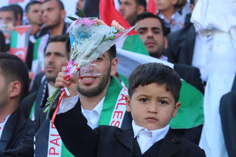 زف 4000 عريس وعروس عصر اليوم الأحد، في حفل زفافي جماعي في مدينة غزة بتمويل من وزارة الشئون الدينية التركية ووكالة التنسيق والتعاون التركي "تيكا" التركية الحكومية، حيث انطلقت زفة العرسان من أرض السرايا باتجاه ملعب اليرموك، إضافة إلى مواكب لزفاف عرسان منطقتي الوسطى والجنوب في قطاع غزة، ورفعت اعلام فلسطين وتركيا وصور للرئيس التركي رجب طيب أردوغان، بحضور وزراء حكومة التوافق في غزة، وممثلين عن الفصائل بغزة، وتخلل الحفل فقرات فنية وتراثية.