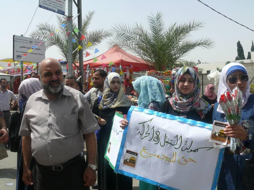 وشارك جميع الحاضرون مع الشرطة في توزيع ملصقات وورود على السيارات في الشارع العام دعم وتضامن مع حقوق ذوي الإعاقة في التنقل والحركة بمشاركة فريق ديرنا الشبابي في دير البلح والمجلس الشبابي في النصيرات التابع لجمعية نور المعرفة وكافة مؤسسات شبكة التحويلات في المنطقة الوسطى بشكل متزامن
