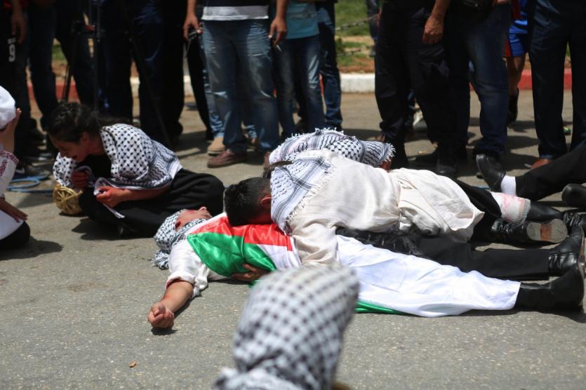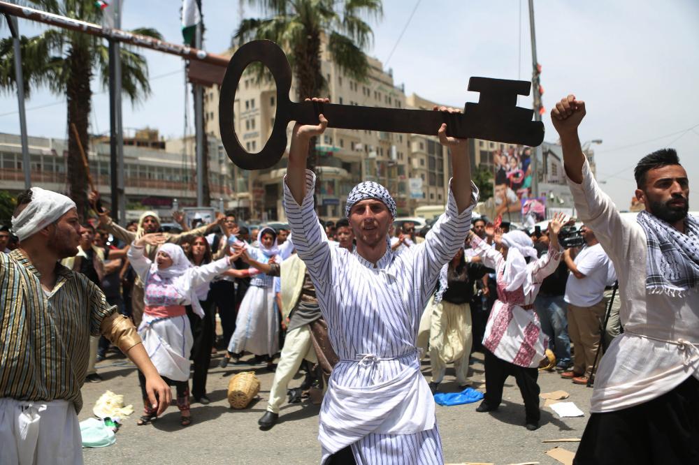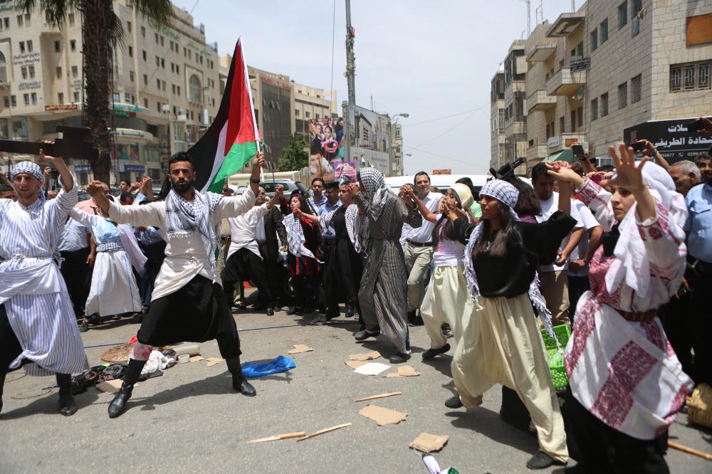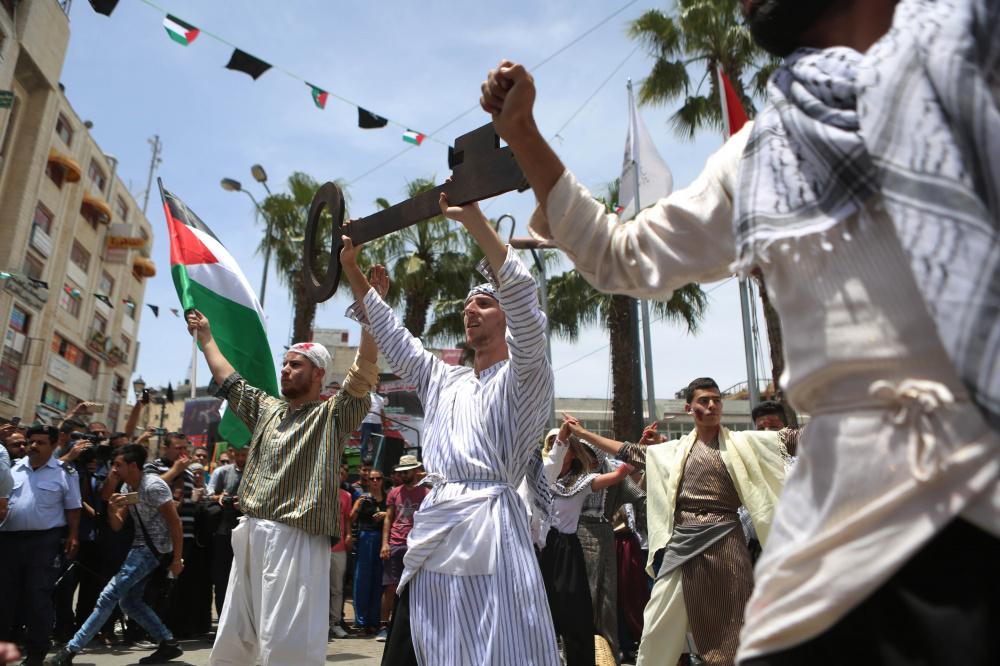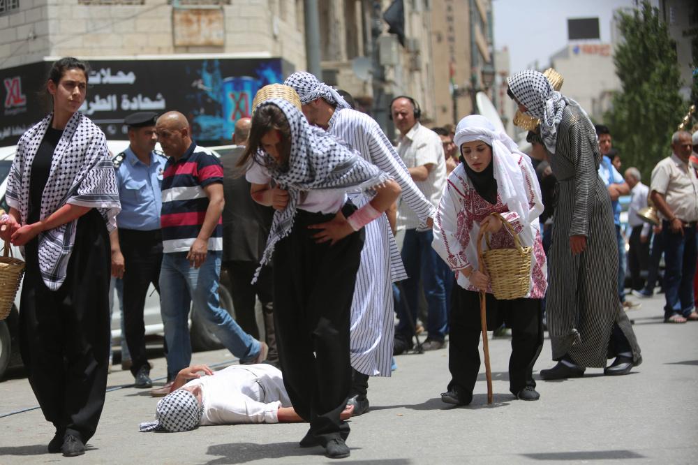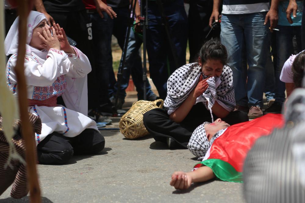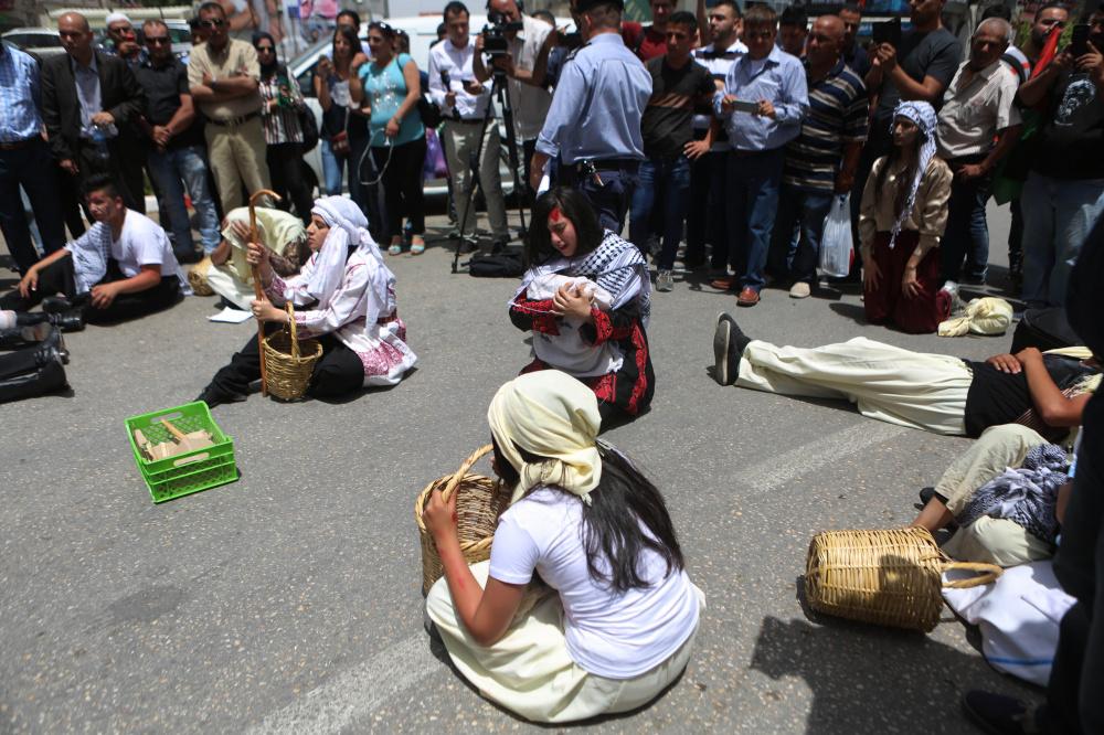 إعادة تمثيل مشهد من النكبة عام 1948 خلال مسيرة بمناسبة ذكرى النكبة في مدينة رام الله