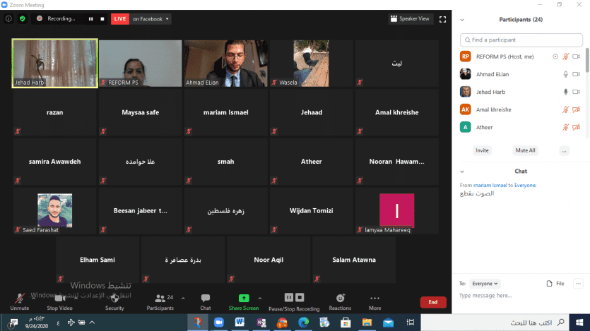 ناقشت المؤسسة الفلسطينية للتمكين والتنمية المحلية— REFORM حالة العنف المسلط على المرأة داخل الأسرة وذلك في لقاء مفتوح نفذ عبر تقنية الربط الالكتروني التفاعلي ZOOM بمشاركة الباحث جهاد حرب، والسيدة الهام سامي مدير عام التأثير والاعلام والاتصال في وزارة شؤون المرأة، والسيدة آمال خريشة مديرة جمعية المرأة العاملة، والسيد أحمد عليان ميسر اللقاء، وعدد من مستفيدي مشروع دور المرأة في تعزيز السلم الاهلي في محافظة الخليل.