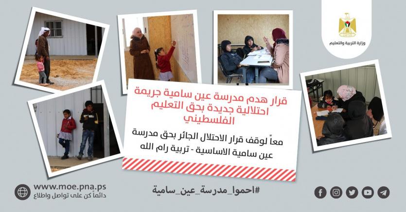 اعتبرت وزارة التربية والتعليم أن قرار محكمة السلطة القائمة بالاحتلال، والقاضي بهدم مدرسة عين سامية الأساسية التابعة لمديرية تربية رام الله والبيرة، بناءً على قرار ما تسمى "الإدارة المدنية" هو إمعان في مسلسل متواصل لاستهداف التعليم الفلسطيني بمكوناته كلها.