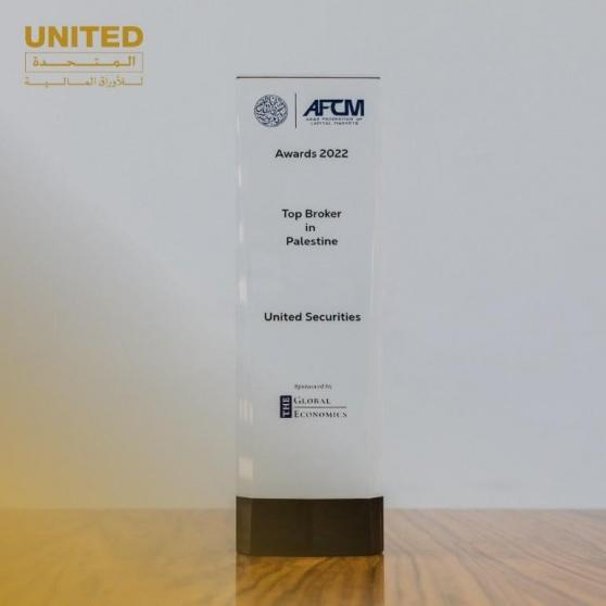 حصدت الشركة المتحدة للأوراق المالية جائزة اتحاد الأسواق العربية عن العام 2022 كأفضل وسيط مالي في فلسطين، وذلك بترشيح من المجلة العالمية الرائدة في مجال القطاعات التجارية والمصرفية والاستثمارات "The Global Economy".