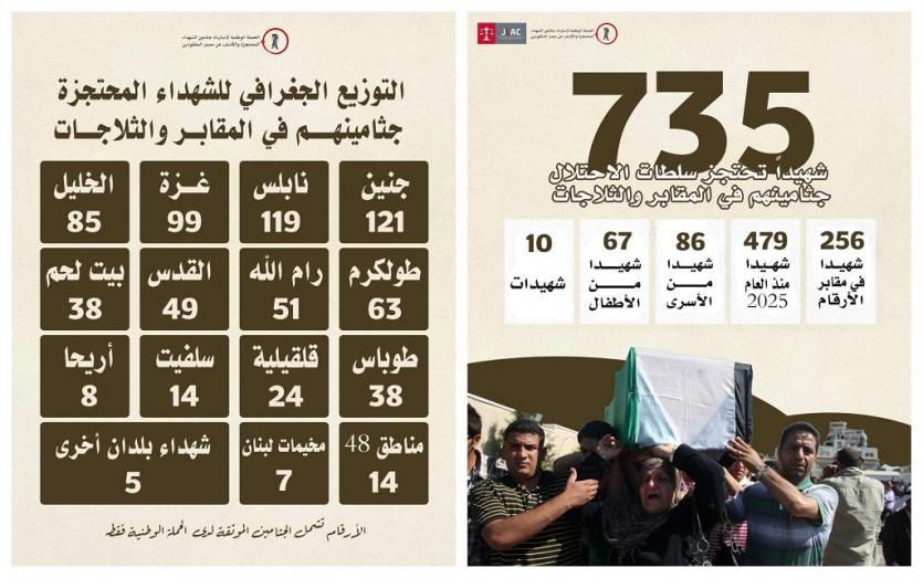 قالت الحملة الوطنية لاسترداد جثامين الشهداء المحتجزة والكشف عن مصير المفقودين، اليوم الجمعة، إن سلطات الاحتلال الإسرائيلي تحتجز جثامين 735 شهيدا في مقابر الأرقام والثلاجات.