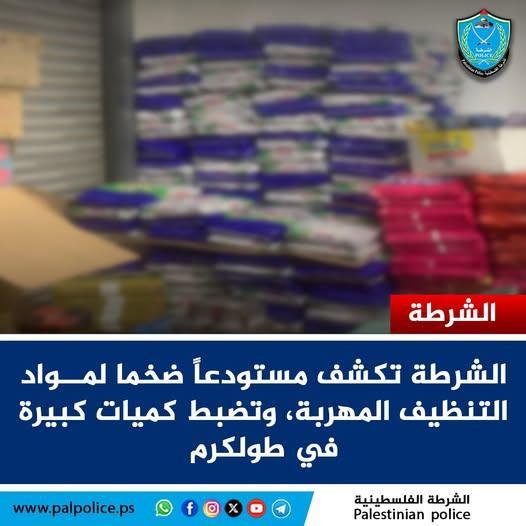 في عملية نوعية، ضبطت الشرطة وبإسناد من الضابطة الجمركية ووزارة الاقتصاد الوطني، مستودعاً ضخما يحتوي على كميات كبيرة من مواد التنظيف المهربة والمغشوشة داخل مخزن في إحدى البلدات شرق طولكرم.