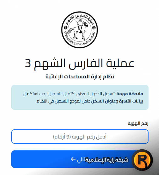 تنبيه: يرجى الحذر من المواقع الوهمية؛ عملية الفارس الشهم 3 لا تطلب أي رسوم مالية مقابل التسجيل أو استلام المساعدات.