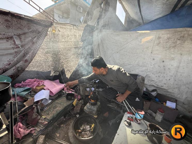 محمد فقد ساقه خلال الحرب، وبفقدانها تغيّر كل شيء. لم يعد قادرًا على الخروج لجلب الحطب، ولا الوقوف في طوابير الغاز، ولا حتى التنقل بسهولة داخل المخيم. يقول بصوتٍ هادئ يخفي وراءه تعب السنوات: “بترت رجلي في الحرب… ولا بقدر أطلع ولا أنزل. كنت أشوف ولادي حواليّ، وما في غاز ولا حطب، والنار صارت حلم.”