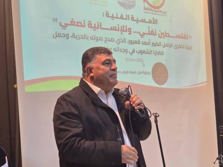 شارك محافظ نابلس غسان دغلس مساء اليوم الخميس الموافق 2/4/2026 في الأمسية الفنية الخاصة التي أقيمت إحياءً لذكرى الراحل الكبير أحمد قعبور تحت عنوان "لفلسطين نغني وللإنسانية نصغي"، وذلك بحضور ممثلي المؤسسات والفعاليات الوطنية والمجتمعية في محافظة نابلس.