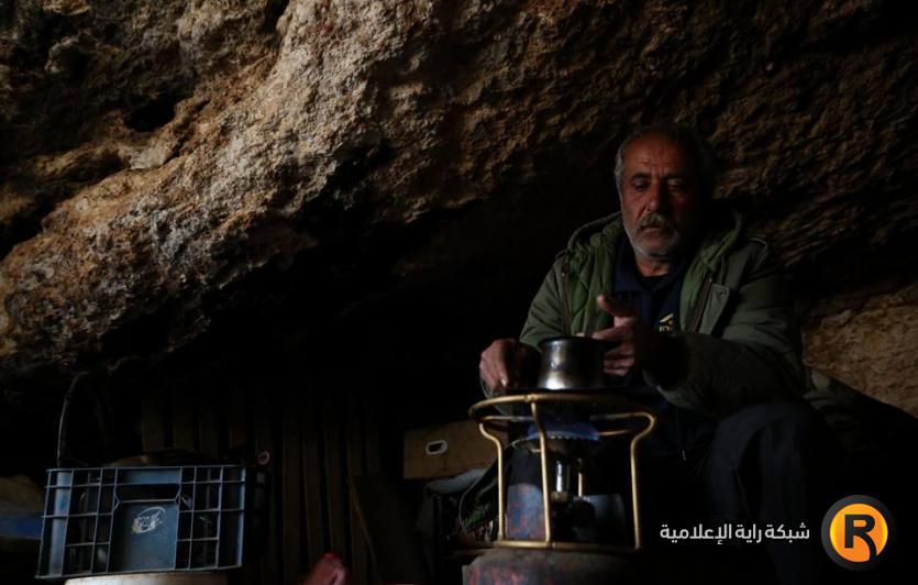 على نار هادئة يعد قهوته داخل كهف اعتاد العيش فيه منذ سنين في خربة طانا شرق نابلس.