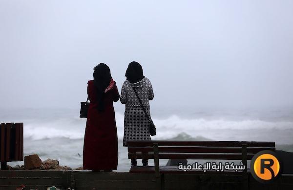 صديقتان تتبادلان الاحاديث في يوم شتوي بارد امام أمواج بحر غزة.