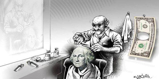 وتناول خليل في لوحته التي فازت السعي الأميركي لتكريس هيمنة الدولار على اقتصاد العالم، من خلال رسم رمزي جمع خلاله عدداً من الفنون البصرية على رأسها الكاريكاتير.