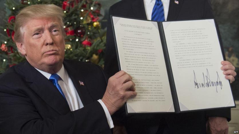 الرئيس الأمريكي دونالد ترامب خلال توقيعه على قرار اعلان القدس عاصمة للاحتلال