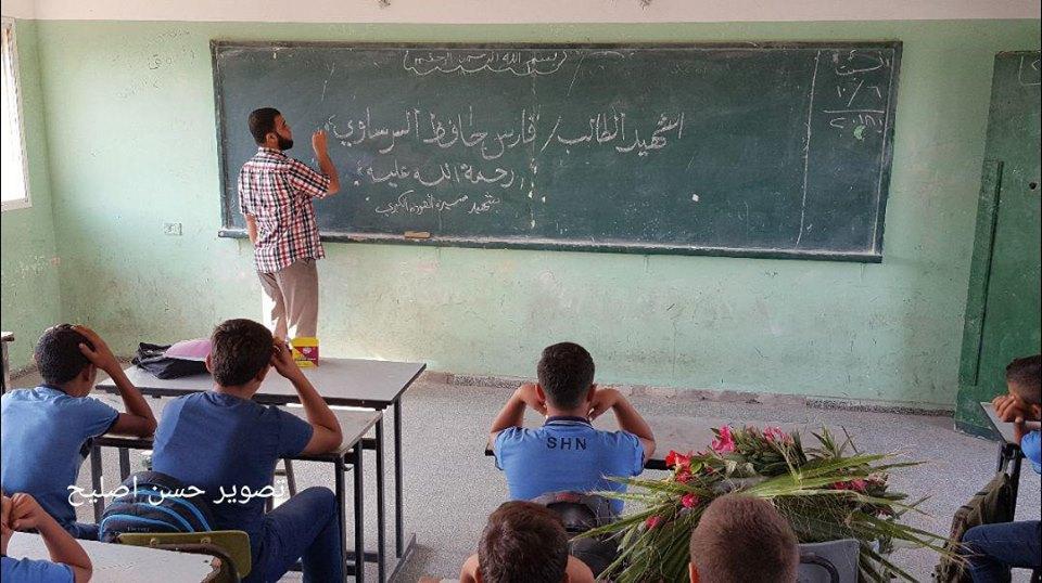 داخل المدرسة، أخذ الطفل القيشاوي يتجول بين الممرات، حاملا صورة الشهيد فارس ليعرف الطلاب به، كما وضع صورة له على بوابة الفصل الذي يدرس فيه، يقول ودموعه لم تتوقف: "أخبرني صديقي فارس أنه ذاهب نحو مخيمات العودة للمشاركة، ولم أكن أتوقع أنه سيعود شهيدا وانه لن يجلس بجواري مجددا".