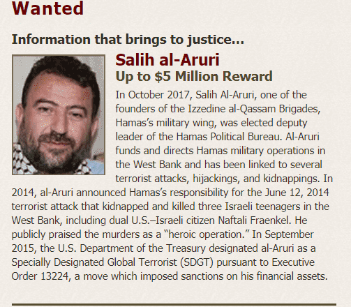 رصد برنامج "مكافآت العدالة" الأميركي الخاص "بمكافحة الإرهاب" التابع لوزارة الخارجية الأميركية، مبلغا ماليا قدره 10 مليون دولار لمن يدلي بمعلومات عن صالح العاروري نائب رئيس المكتب السياسي لحركة حماس، والأسيرة المحررة أحلام التميمي.