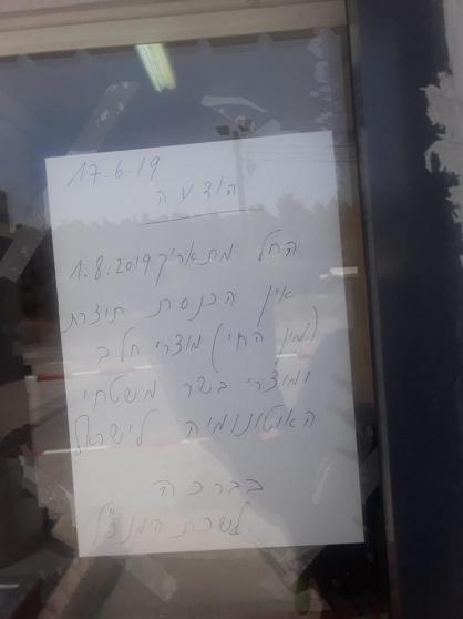 الصقت سلطات الاحتلال اخطارا على زجاج مركز استقبال وفحص المنتجات الفلسطينية المتجهة للقدس، يفيد بمنع دخول منتجات الألبان والأجبان الفلسطينية إلى مناطق شرق القدس، ابتداء من تاريخ 1-8-2019.