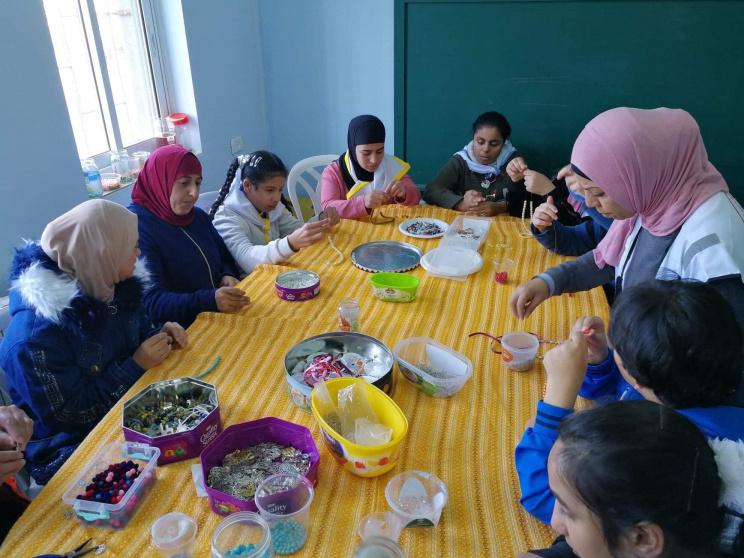 خيوط ومقصّات، حبات خرز ملونة، منها الفيروزي والنهدي والكريمي وألوان العلم الفلسطيني وأكثر، تداعبها أنامل مرتجفة لأمر متصل بالجهاز العصبي، وتبنيها واحدة وراء الأخرى بروح مليئة بالحياة رغم الإعاقات المختلفة لا سيّما الاعاقة العقلية.