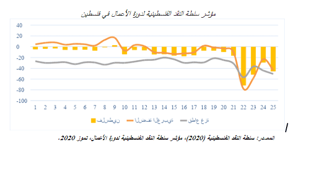 كشفت نتائج "مؤشر سلطة النقد الفلسطينية لدورة الأعمال" لشهر تموز 2020 عن عودة المؤشر الكلي للتراجع بشكل ملموس إلى حوالي -45.7 نقطة قياساً إلى -29.2 نقطة في الشهر السابق، على إثر عودة الإغلاق شبه التام منذ بداية شهر تموز على مختلف الأنشطة الاقتصادية بعد الدخول في الموجة الثانية من انتشار فايروس كورونا.