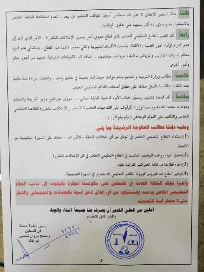 وفيما يلي بيان النقابة العامة لأصحاب المدارس ورياض الأطفال الخاصة: