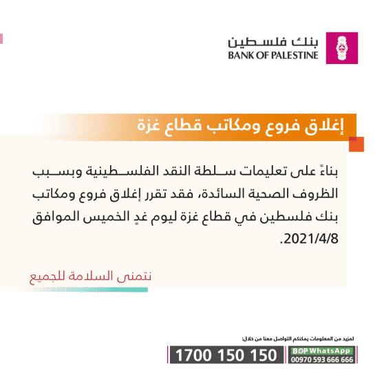 أعلن بنك فلسطين مساء الأربعاء، عن إغلاق كافة فروع ومكاتب البنك المنتشرة في قطاع غزة، ليوم غدٍ الخميس الموافق 08/04/2021، بسبب تفشي وباء كورونا في قطاع غزة.