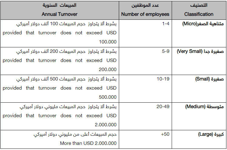 ويأتي التعريف بعد مراجعة شمولية للتجارب الدولية في دعم المنشآت المتناهية الصغر والصغيرة والمتوسطة ودراسة كافة المعايير الدولية والمحلية من خلال لجنة ضمت وزارة الاقتصاد الوطني وسلطة النقد، وجمعية البنوك وبالتشاور الوثيق مع وزارة المالية وهيئة سوق رأس المال و جميع المؤسسات الشريكة.