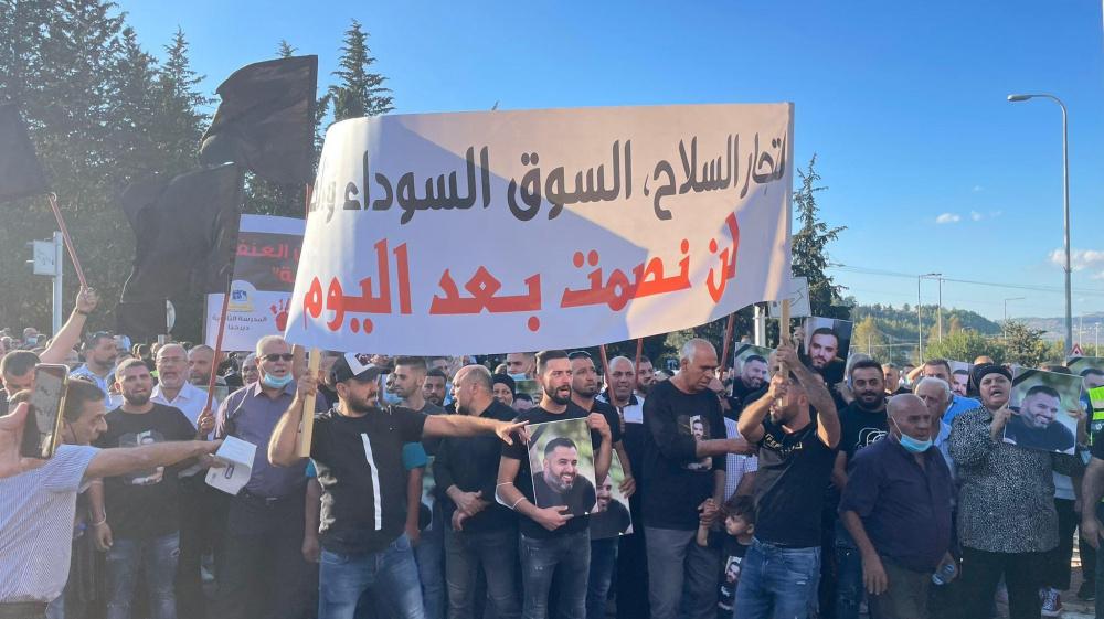 ورفع المحتجون في التظاهرة الأعلام السوداء وصورا لضحايا جرائم القتل، ولافتات منددة بالعنف والجريمة، وأخرى تدين تقاعس الشرطة الإسرائيلية عن القيام بدورها في لجم هذه الظاهرة.