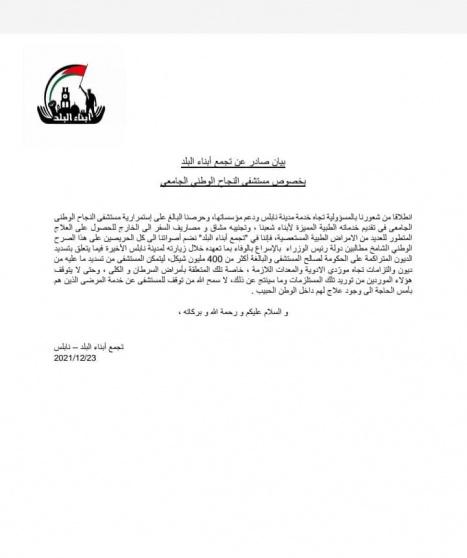 وقال التجمع في بيان له: "انطلاقا من شعورنا بالمسؤولية تجاه خدمة مدينة نابلس ودعم مؤسساتها، وحرصنا البالغ على إستمرارية مستشفى النجاح الوطني الجامعي في تقديم خدماته الطبية المميزة لأبناء شعبنا، وجنيبه مشاق ومصاريف السفر إلى الخارج للحصول على العلاج المتطور للعديد من الأمراض الطبية المستعصية، فإننا في "تجمع أبناء البلد" نضم أصواتنا إلى كل الحريصين على هذا الصرح الوطني الشامخ مطالبين دولة رئيس الوزراء بالإسراع بالوفاء بما تعهده خلال زيارته لمدينة نابلس الأخيرة فيما يتعلق بتسديد الديون المتراكمة على الحكومة لصالح المستشفى والبالغة أكثر من 400 مليون شيكل".