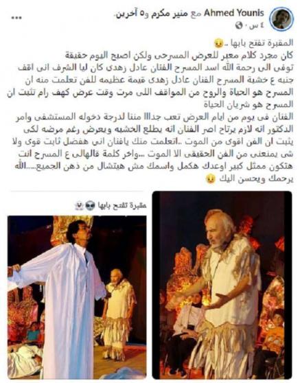 وتابع: "توفى إلى رحمة الله أسد المسرح الفنان عادل زهدي، كان ليا الشرف إني أقف جنبه على خشبة المسرح الفنان عادل زهدي قيمة عظيمه للفن تعلمت منه إن المسرح هو الحياة والروح".