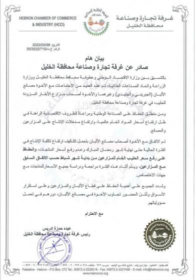 وأكدت غرفة الخليل في بيان رسمي، أنه سيتم الحفاظ على رفع سعر الحليب الخام للمزارعين من بداية شهر شباط حسب الاتفاق السابق مع المزارعين.