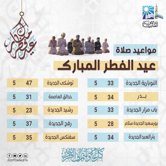 موعد توقيت صلاة عيد الفطر في مصر 2022 وفق ما نشرته دار الإفتاء المصرية عبر تويتر حيث أوردت قائمة تشمل مواعيد صلاة العيد في جميع المحافظات من بينها العاصمة القاهرة.