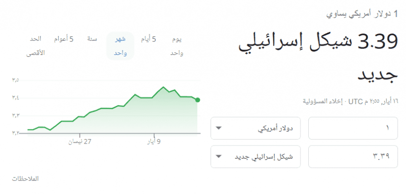 ووصل سعر صرف الدولار مساء اليوم إلى 3.39 شيكل، بعدما كان يصرف صباح اليوم بـ 3.40 شيكل.