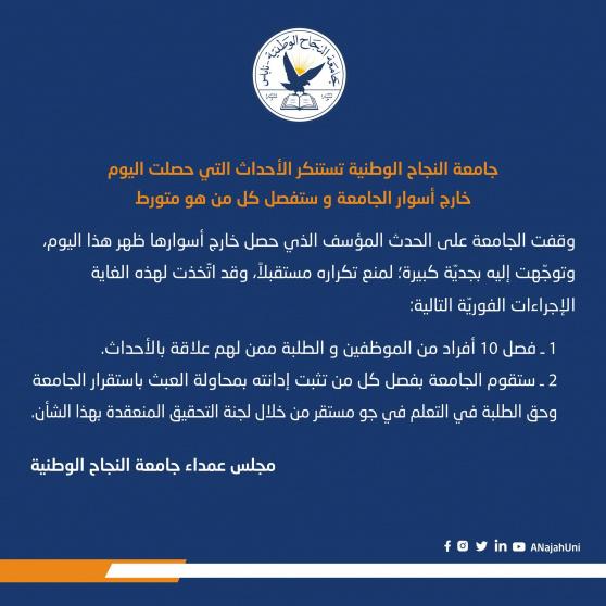 استنكرت جامعة النجاح الوطنية، الأحداث التي حصلت اليوم الأحد، خارج أسوار الجامعة، مؤكدة أنها قررت فصل 10 أفراد من الطلبة والموظفين ممن لهم علاقة بالأحداث، كما ستفصل كل من هو متورط.