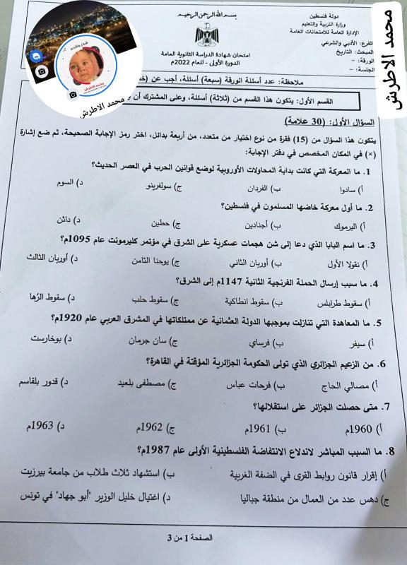 إجابات امتحان التاريخ للثانوية العامة 2022 توجيهي فلسطين الفرع الأدبي