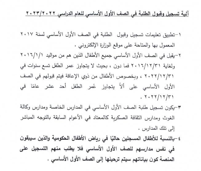 وأشارت الوزارة إلى أنه لا يلزم التَّسجيل عبر الرَّابط للطلبة المسجَّلين حاليًا في رياض الأطفال، الباقين في نفس مدارسهم للصَّف الأوَّل الأساسي، لافتة إلى أنه سوف تُرحَّل أسماؤهم تلقائيًا من قبل "التربية والتعليم".
