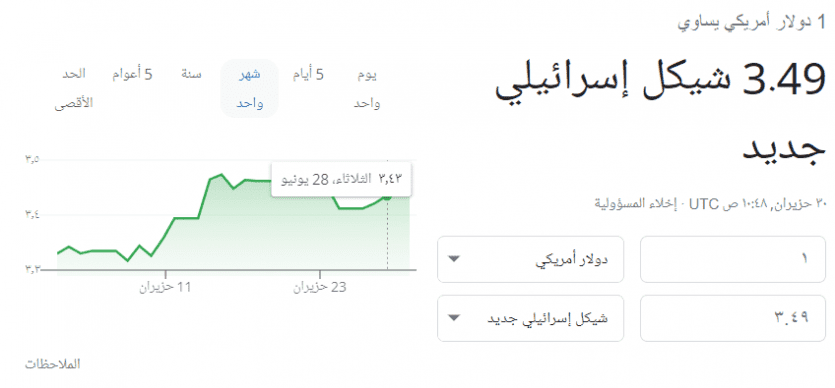 شهد سعر صرف الدولار الآن مقابل الشيكل الاسرائيلي، مساء اليوم الخميس، 30 يونيو 2022، ارتفاعا كبيرا في التداولات المصرفية، عما كان عليه في ساعات الصباح الأولى.
