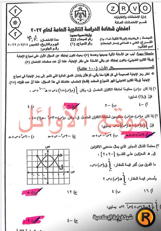 حل امتحان الرياضيات العلمي 2022 توجيهي الأردن: